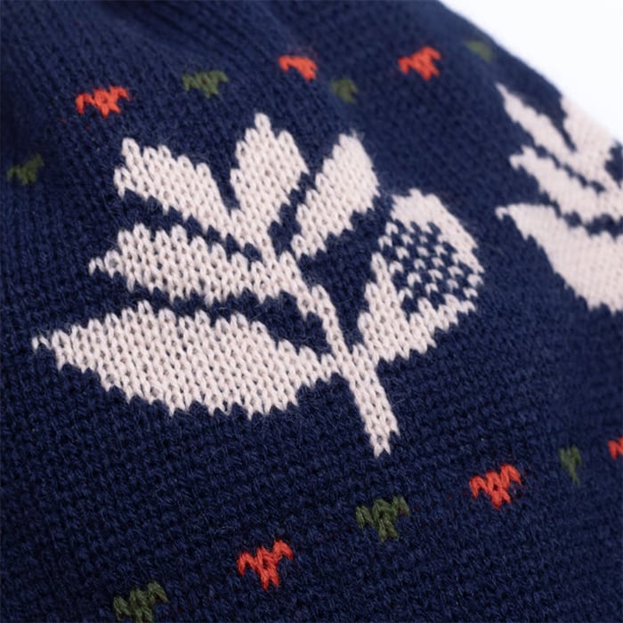 ブランドロゴがあしらわれたノルディック(リーフ柄)のデザインが施されたシングルビーニー。