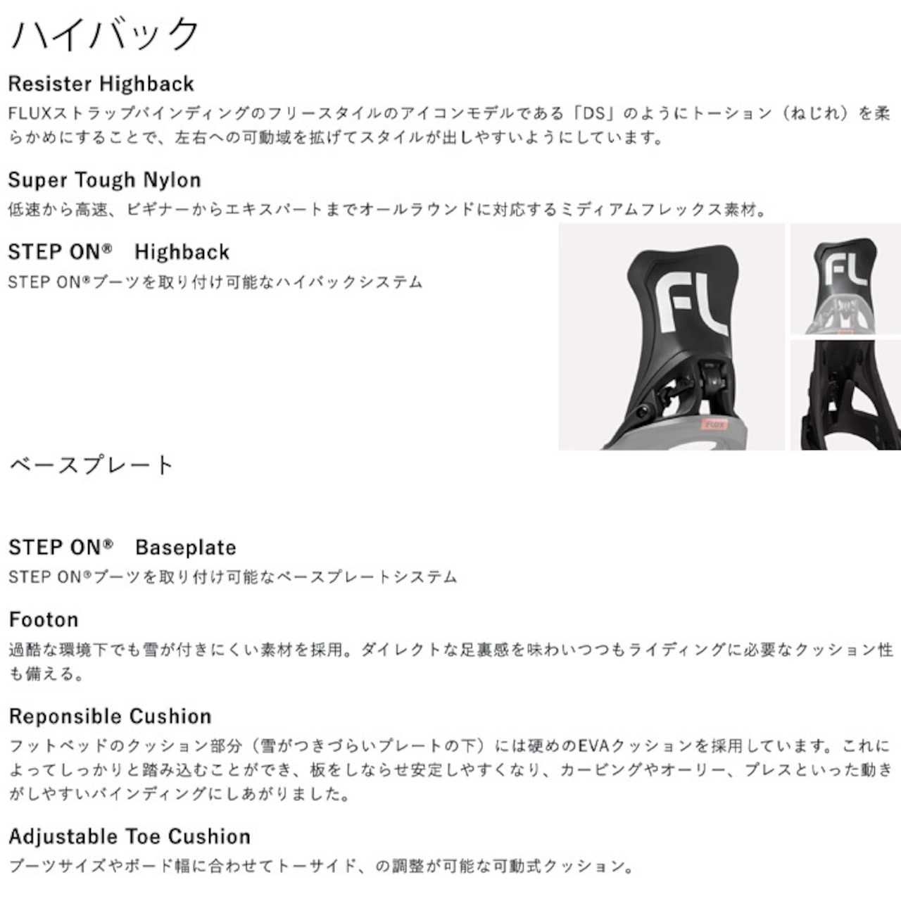ハイバックとフットベッドの硬さやねじれを調整し、STEP ONの脱着の快適さとDSの遊びさやすさを両立したバインディングとなりました。
