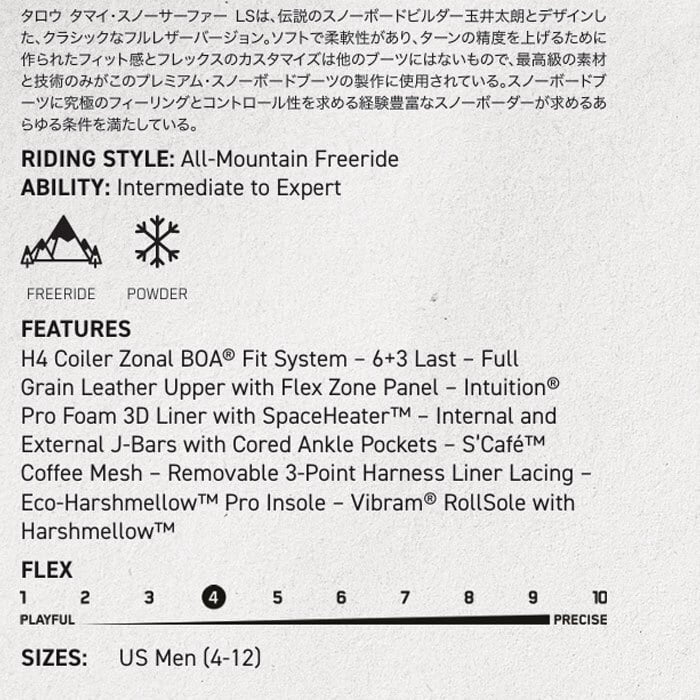 タロウ タマイ・スノーサーファー LSは、伝説のスノーボードビルダー玉井太朗とデザインした、クラシックなフルレザーバージョン。ソフトで柔軟性があり、ターンの精度を上げるために作られたフィット感とフレックスのカスタマイズは他のブーツにはないもので、最高級の素材と技術のみがこのプレミアム・スノーボードブーツの製作に使用されている。スノーボードブーツに究極のフィーリングとコントロール性を求める経験豊富なスノーボーダーが求めるあらゆる条件を満たしている。