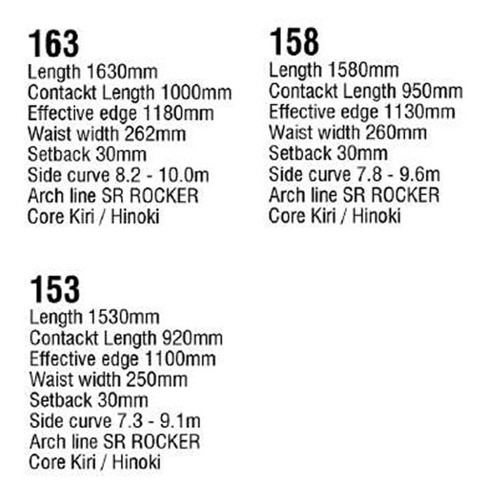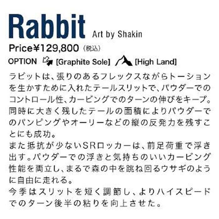 ラビットは、張りのあるフレックスながらトーションを生かすために入れたテールスリットで、パウダーでのコントロール性、カービングでのターンの伸びをキーブ。同時に大きく残したテールの面栢によりパウダーでのパンピングやオーリーなどの縦の反発力を残すことにも成功。また抵抗が少ないSRロッカーは、前足荷重で浮き出す。パウダーでの浮きと気持ちのいいカービング性能を両立し、まるで森の中を跳ね回るウサギのように自由に走れる。今季はスリットを短く調節し`よりハイスピードでのターン後半の粘りを向上させた。